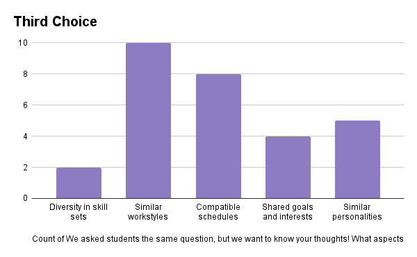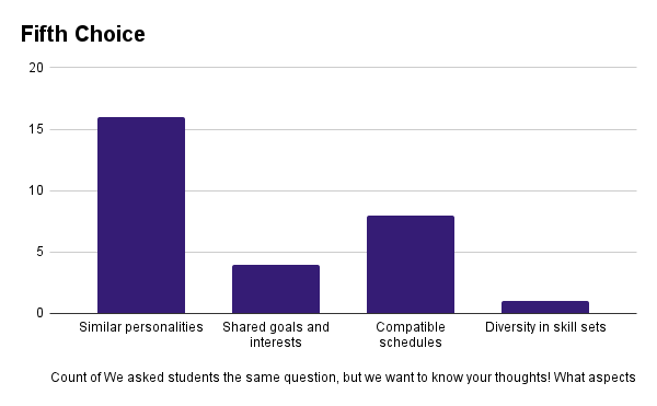 Professors were asked to rank one through five the most important aspects of group formation. Based on this information we gathered on average professors preferred students be matched by diversity in skill and shared goals over their compatible schedules and personalities.