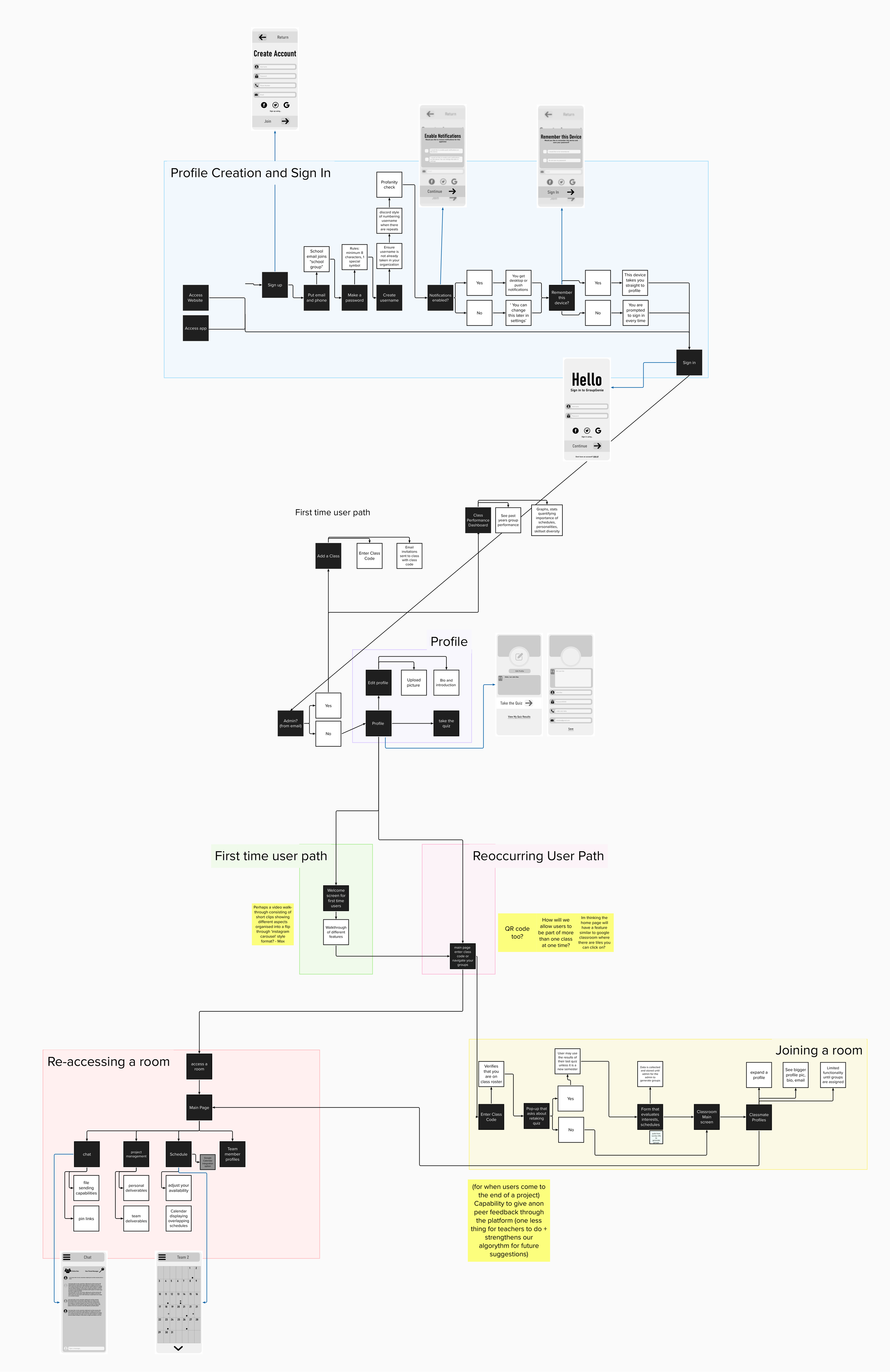 Based on the starting research our original idea started with a wire frame and low fidelity models for an app/website that had a quiz to match you with your ideal groups and messaging boards and places to keep track of group work and efforts. This would also be a service that allowed you to have many classes flow through the same hub having a one stop shop for all you classes work in one easy to access place.